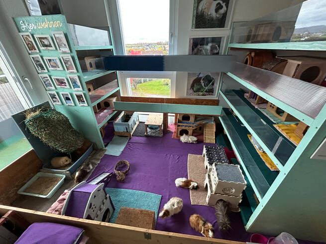 - Es sollten genügend Rückzugsmöglichkeiten vorhanden sein, welche auch immer mindestens zwei Ein- und Ausgänge haben. So kann vermieden werden, dass das eine Meerschweinchen, von einem anderen in die Enge getrieben wird.
