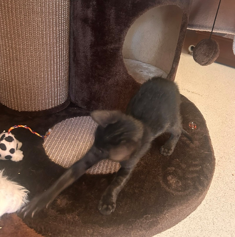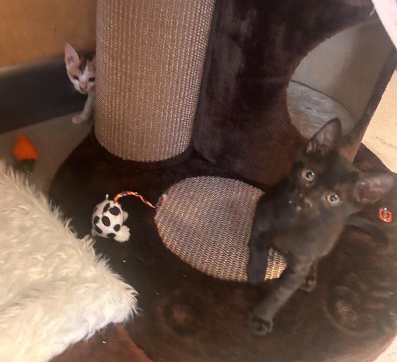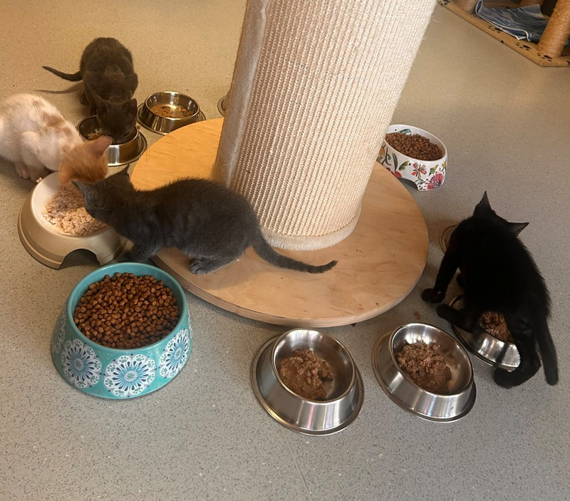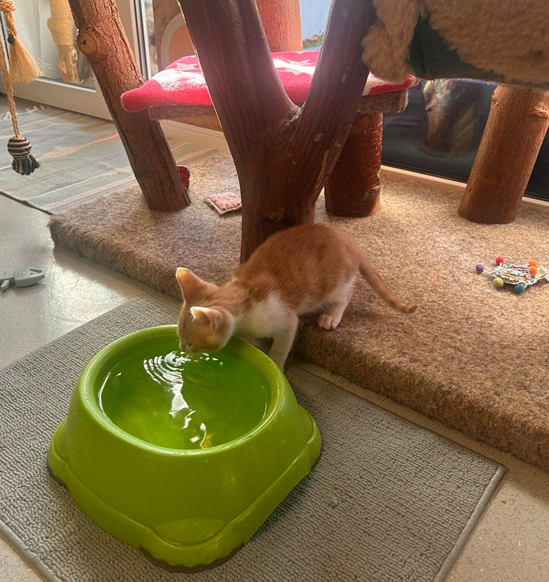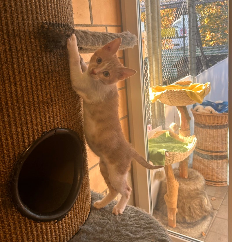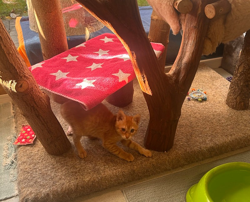Sooo, endlich ist es soweit. Die ausgesetzten Kitten sind mittlerweile so gut entwickelt, dass sie vom Pflegeplatz zu uns ins Tierheim kommen konnten. Denn in den nächsten 2-3 Wochen sind sie bereit, um in ihre neuen Familien zu ziehen. Sie erkunden ganz fleissig das grosse Zimmer und klettern von "z'underscht bis z'oberscht" und haben einen riesen Spass dabei. Wir vermuten mittlerweile, dass irgendeine orientalische Katzenrasse mitmischte, denn die Kleinen sind total schlank und hochbeinig, die zarte Hope hat sogar Devon-Rex-Fell, wie wir finden. Sehr spannend zu sehen, in welche Richtung sich ihr Aussehen veränderte.